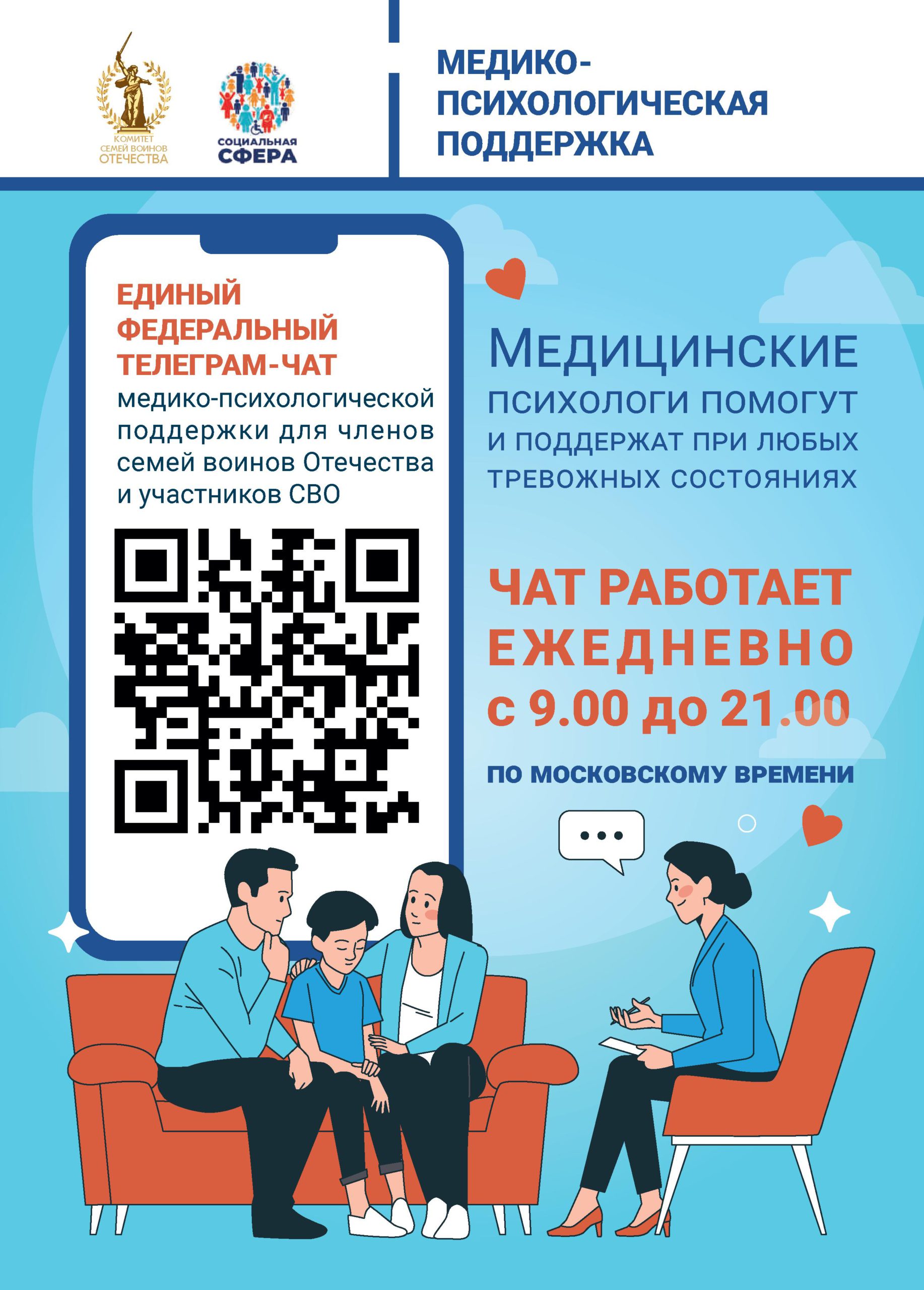 В телеграмм-чате команда квалифицированных государственных медицинских психологов консультирует по различным тревожным состояниям участников СВО и членов их семей, а так же мирное население приграничных территорий.